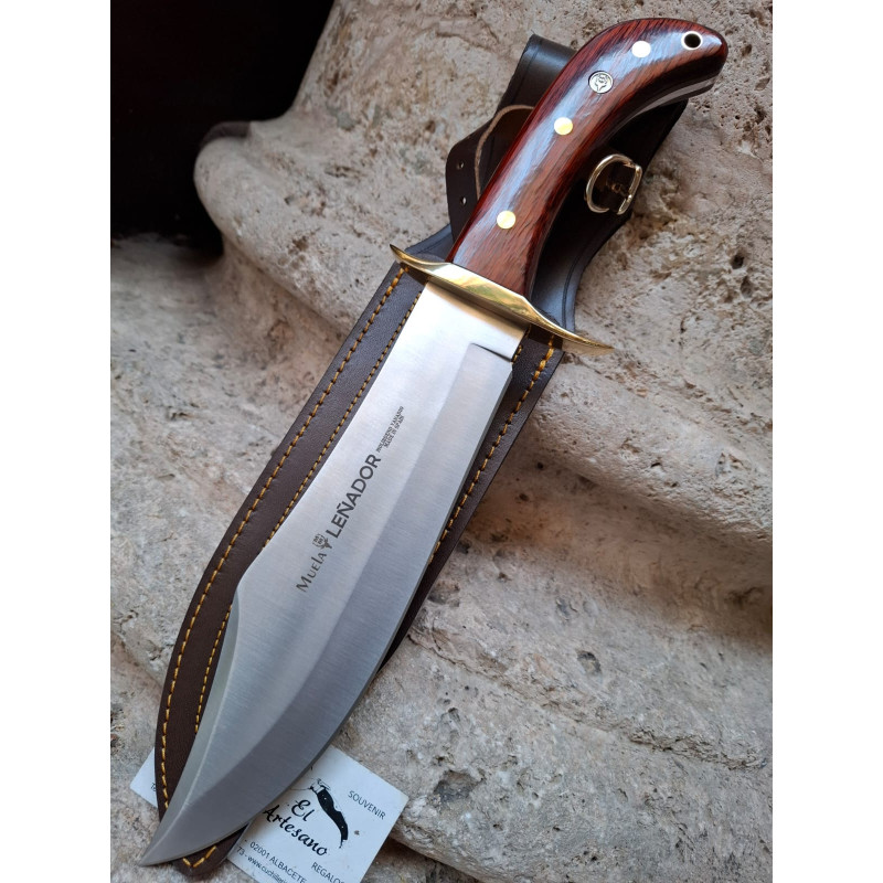 Novedad cuchillo de monte o machete Muela modelo LEÑADOR, hoja de acero Mova 1.4116, todo una pieza enterizo, virola de latón con mango en palorojo, remachado con remaches de latón, tamaño de hoja 25 cm, tamaño mango 13,5 cm, con funda de piel de primera calidad.