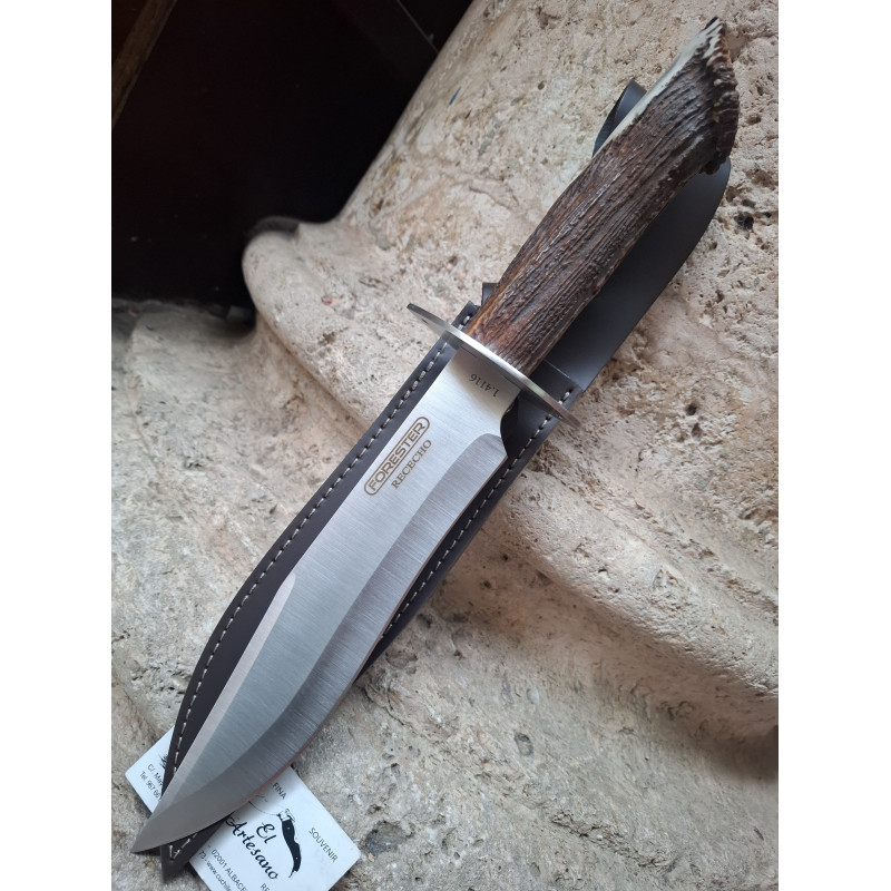 Cuchillo de monte de o machete bowie Rececho Forester, fabricado por Juan Martínez de J&v , hoja de acero Mova, mango de asta de ciervo con roseta y virola de acero, tamaño de hoja 25,5 cm ,mango 17cm aproximado , con funda de piel.