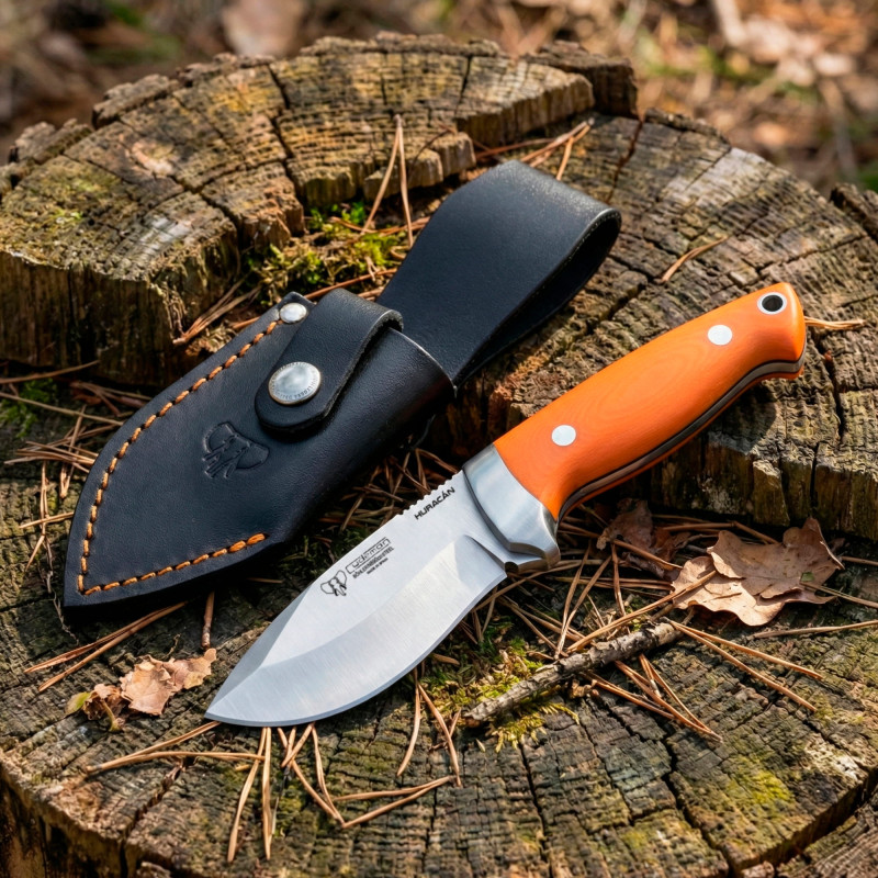 SÚPER OFERTA ANTES 87EUROS AHORA 69,80EUROS cuchillo HURACÁN de Cudeman, hoja de acero böhler N690co, vaciado cóncavo, mango de G10 naranja y virola de acero, todo una pieza, enterizo, remachado, tamaño de hoja 9 cm, tamaño total 20 cm, grosor de hoja 5 mm, peso 318 gramos, con funda de piel de primera calidad.