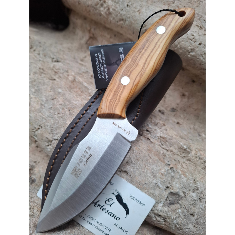 Cuchillo de joker CEBRA con hoja de acero mova, mango de madera de olivo, todo una pieza hasta atrás, tamaño de hoja 12 cm,tamaño corte 11cm, tamaño total 22,5 cm, con funda de piel.