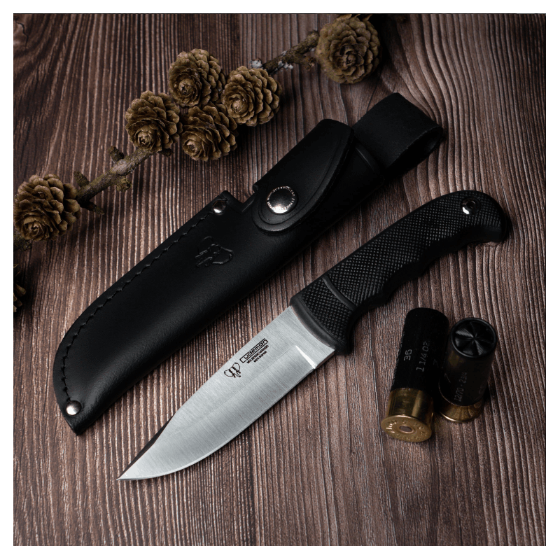 147-H Cuchillo de caza o machete Cudeman, hoja de acero molibdeno vanadio; dureza del acero: 54/56 hrc; longitud de hoja: 11 cm; longitud de mango: 11,5 cm; longitud total: 22,5 cm; grosor de hoja: 4 mm; mango: caucho negro; funda: cuero negro (incluida); extra: agujero para cordón fiador; peso cuchillo: 159 gr.