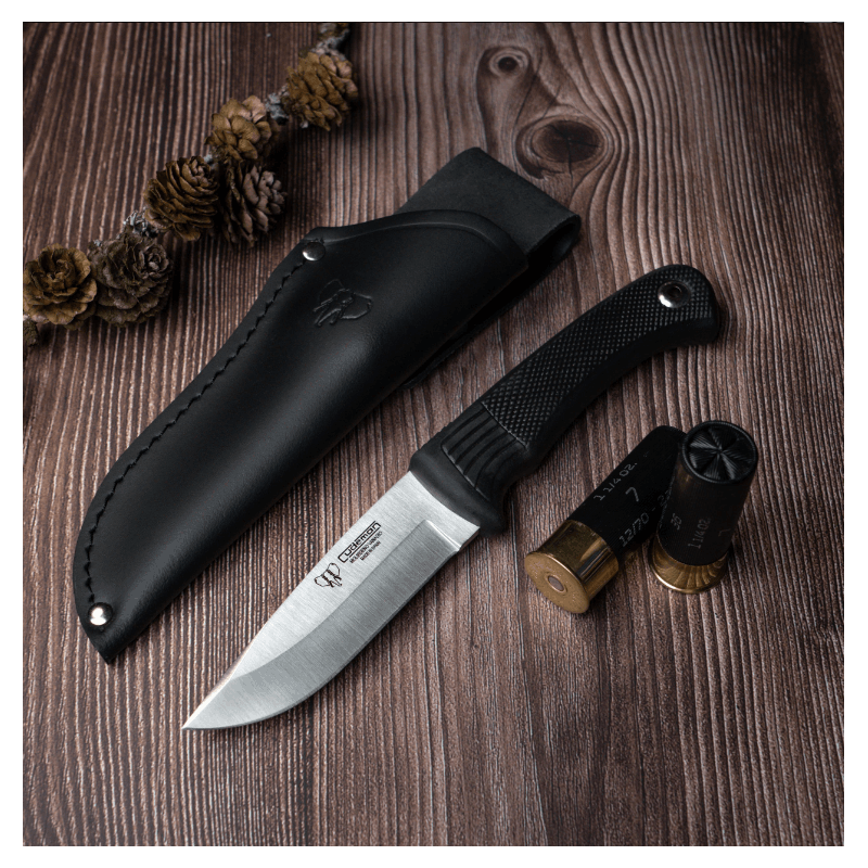 151-H Cuchillo de caza o machete Cudeman, hoja de acero molibdeno vanadio; dureza del acero: 54/56 hrc; longitud de hoja: 10 cm; longitud de mango: 11 cm; longitud total: 21 cm; grosor de hoja: 4 mm; mango: caucho negro; funda: cuero negro (incluida); extra: agujero para cordón fiador; peso cuchillo: 132 gr.