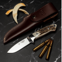 254-C Cuchillo de supervivencia o machete de Cudeman HUNTING AKELEY. Hoja de acero BÖHLER N-690co, longitud de hoja 10 cm, grosor de hoja 4,3 mm, enterizo, mango de ciervo y virola de acero y funda de cuero.