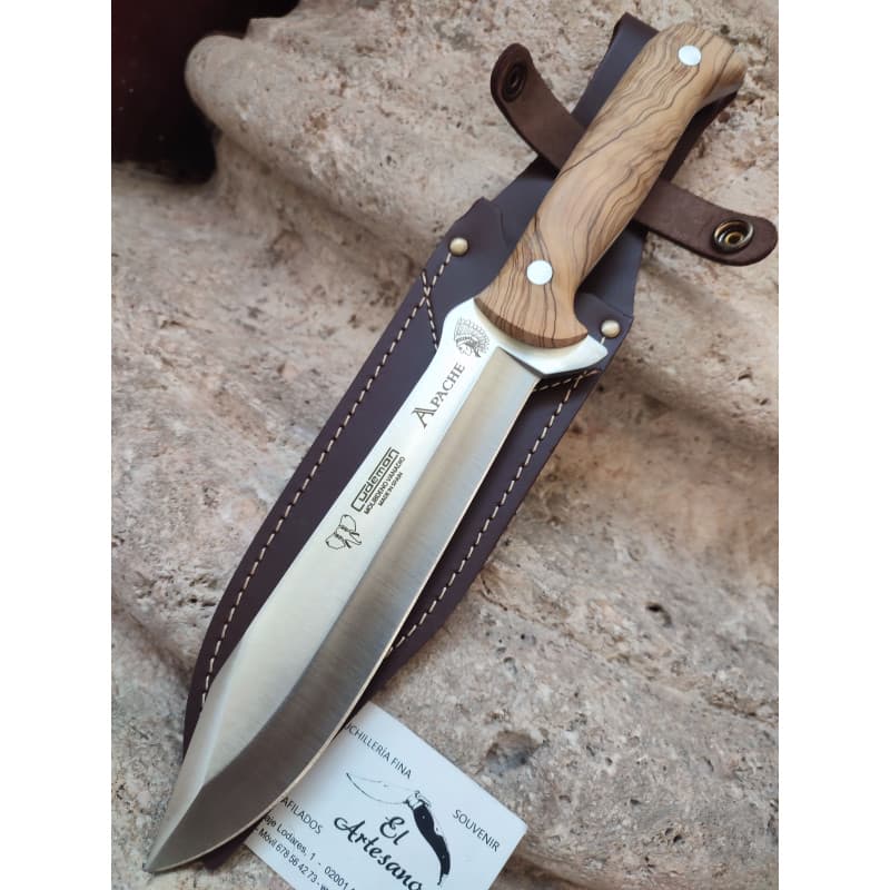 117-L Cuchillo de Cudeman modelo Apache con hoja de acero molibdeno vanadio, mango de madera de olivo, tamaño de hoja 19,5 cm, grosor de hoja 5 mm, todo una pieza hasta atrás, con funda de piel.