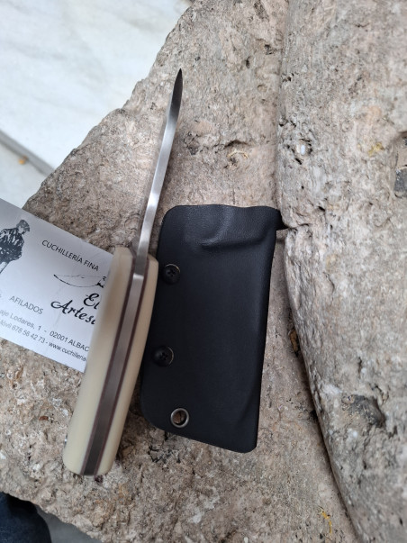 Mango diferentes encavados, en micarta blanca con separadores en marron la funda en kydex color negro con agujero en mango para cordón fiador.