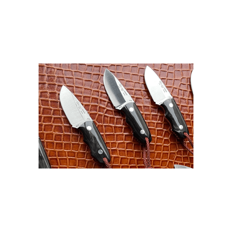 Cuchillo de Miguel Nieto modelo chaman micra, hoja de acero an58, mango de búfalo de agua, remachado todo una pieza enterizo, tamaño de hoja 6 cm, tamaño total 12 cm, espesor de hoja 4,2 mm, con funda de piel con paracord