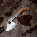 167-L Hacheta de Cudeman modelo Yuka, hoja de acero molibdeno vanadio, mango de madera de olivo, todo una pieza enteriza, tamaño de hoja 35 cm, grosor de hoja 5 mm, con funda de piel.
