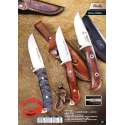 3 HUSKY-11RM Cuchillo de caza o monte de muela, hoja de acero sandvik 14c28n, dureza de acero: 57-58 hrc, mango de madera prensada de rosewood, tamaño hoja 11 cm, mango 11,5 cm; peso 232 gr. incluye funda de piel color marrón.