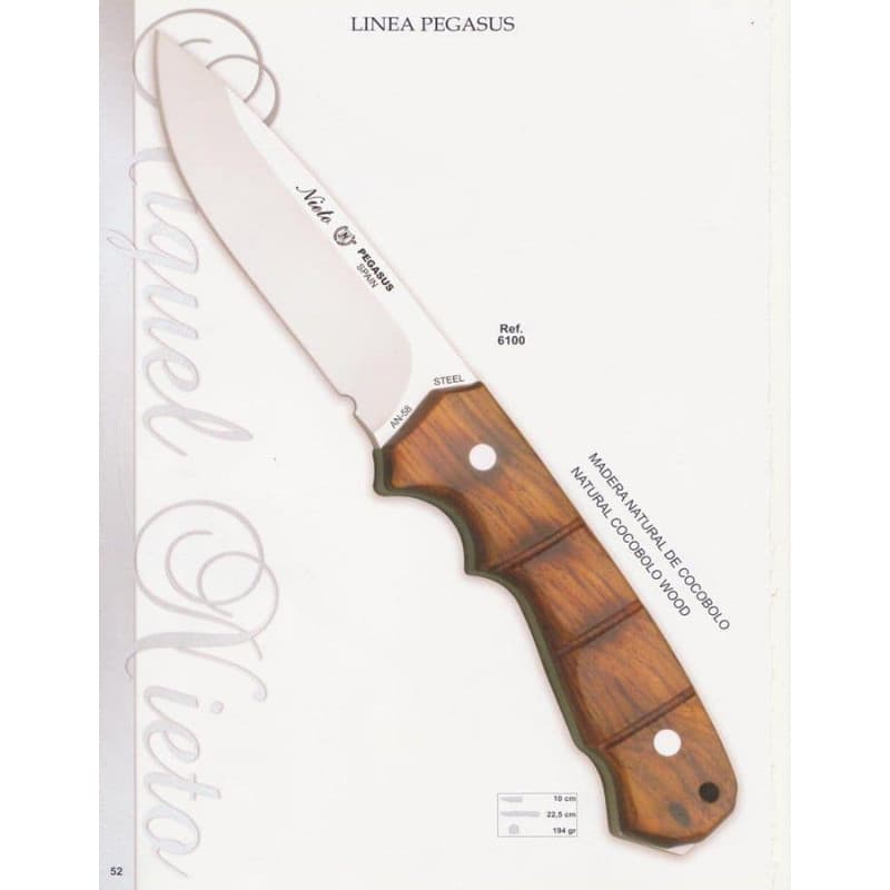 6100 Cuchillo de monte o machete de M. Nieto modelo Pegasus, denominación de origen AB, acero an58, remachado con remaches de acero, mango de madera de cocobolo moldeada y ranurada, con punta rompecristales, tamaño de hoja 11 cm, mango de 12,50 cm, peso 194 gramos, grosor de hoja 5 mm, toda una pieza que se ve por donde va, con una funda de piel especial de primera calidad.