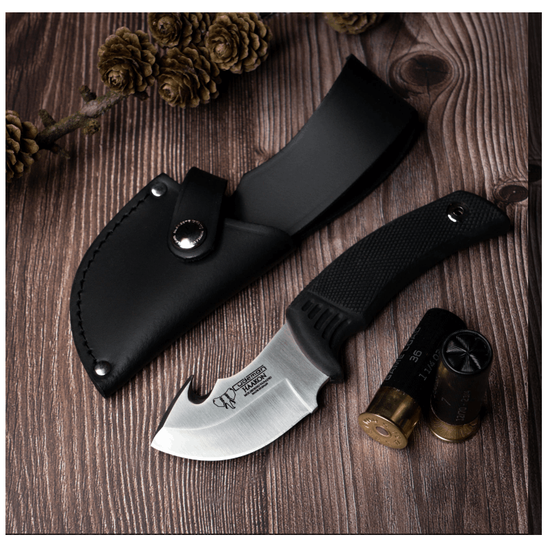137-H Cuchillo desollador de Cudeman modelo Haakon, hoja de acero molibdeno vanadio con gancho desollador, dureza del acero 54/56 HRc, mango de caucho negro, tamaño de hoja 7 cm, grosor de hoja 3,8 mm, con funda de cuero negro.