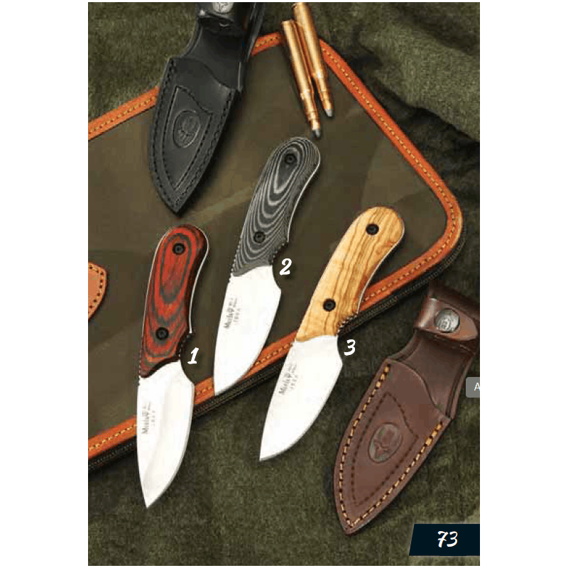 2 IBEX-8M Cuchillo desollador de Muela, hoja de acero 1.4116, mango de madera mikarta, tamaño de hoja 75 mm, mango de 95 mm, con funda de piel.