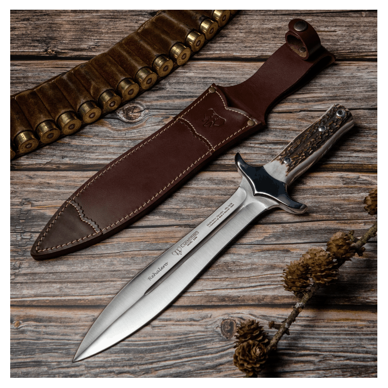 104-C Cuchillo de remate de Cudeman, hoja enteriza de doble filo de acero mova, mango de asta de ciero y virola de acero, tamaño de hoja de 24 cm, grosor de hoja 5 mm, con funda de piel.