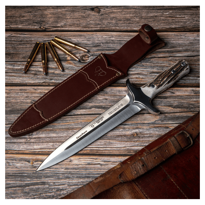 105-C Cuchillo de remate de Cudeman modelo Facochero, hoja enteriza de doble filo de acero mova, mango de asta de ciervo y virola de acero, tamaño de hoja de 23 cm, grosor de hoja 5 mm, con funda de piel.