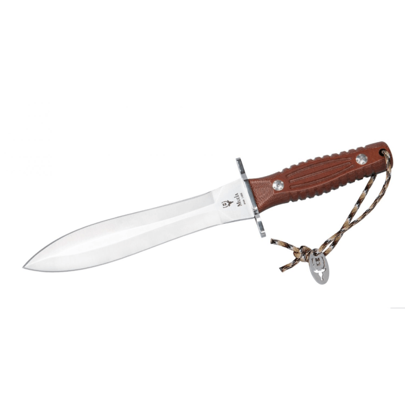 Cuchillo o machete de remate DG 21R, Acero 1.4116 , virola de acero, mango en mikarta marrón , atornillado, con cordón paracord, tamaño de hoja 21cm, con funda de piel