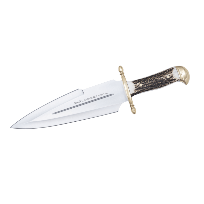 DUQUE-25E Cuchillo de monte o machete de remate de Muela, mango de cuerno de ciervo, virola de latón, hoja de doble filo de acero 1.4116, tamaño hoja 250 mm, mango de 130 mm, todo una pieza hasta atrás, con su funda de piel de primera calidad.