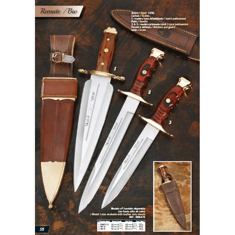 REMATE CORVASI Cuchillo de monte o machete de remate de Muela, mango de madera stamina y virola de latón, hoja de doble filo, cámara de aire, hoja de acero molibdeno vanadio, remachado, tamaño hoja 240 mm, mango 120 mm, todo una pieza hasta atrás, con su funda de piel de primera calidad.