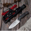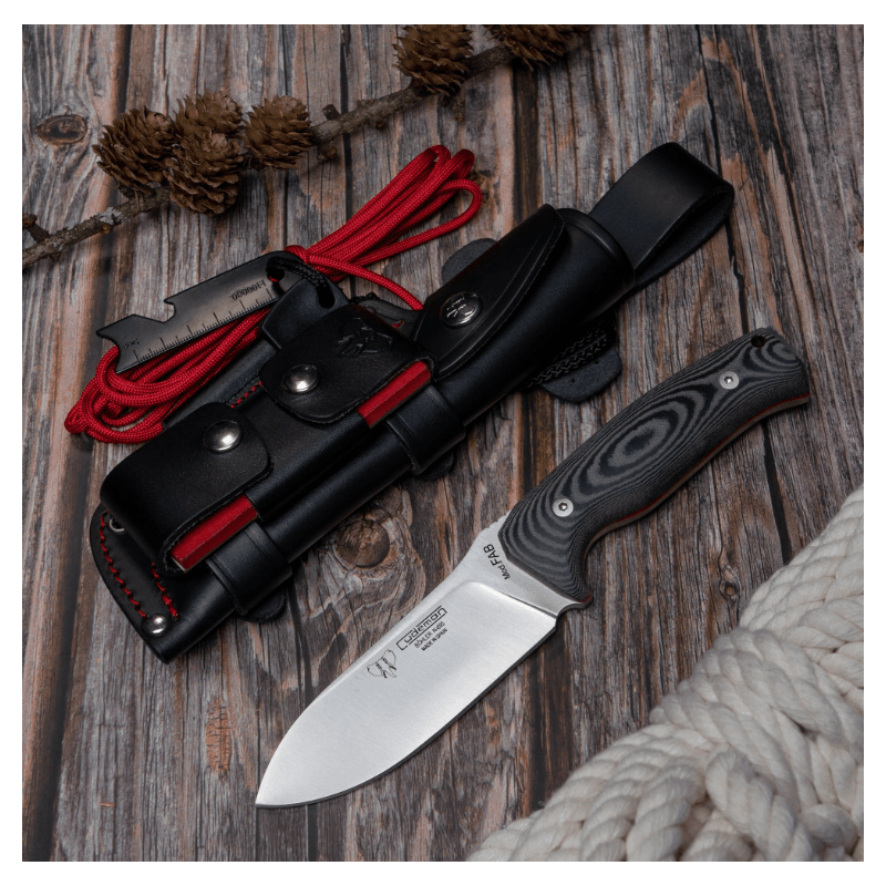 298-MC Cuchillo de supervivencia o caza Cudeman con Kit completo, hoja de acero: N695 Böhler; dureza del acero: 59/61 hrc; longitud de hoja: 11 cm; longitud de mango: 12,5 cm; longitud total: 23,5 cm; grosor de hoja: 5,33 mm; mango: en micarta negra con separador rojo; funda: cuero marrón(incluida) COMPLETA con pedernal, paracord, piedra afilar con regla de 12 cm, espejo de señales, brújula y reloj solar.