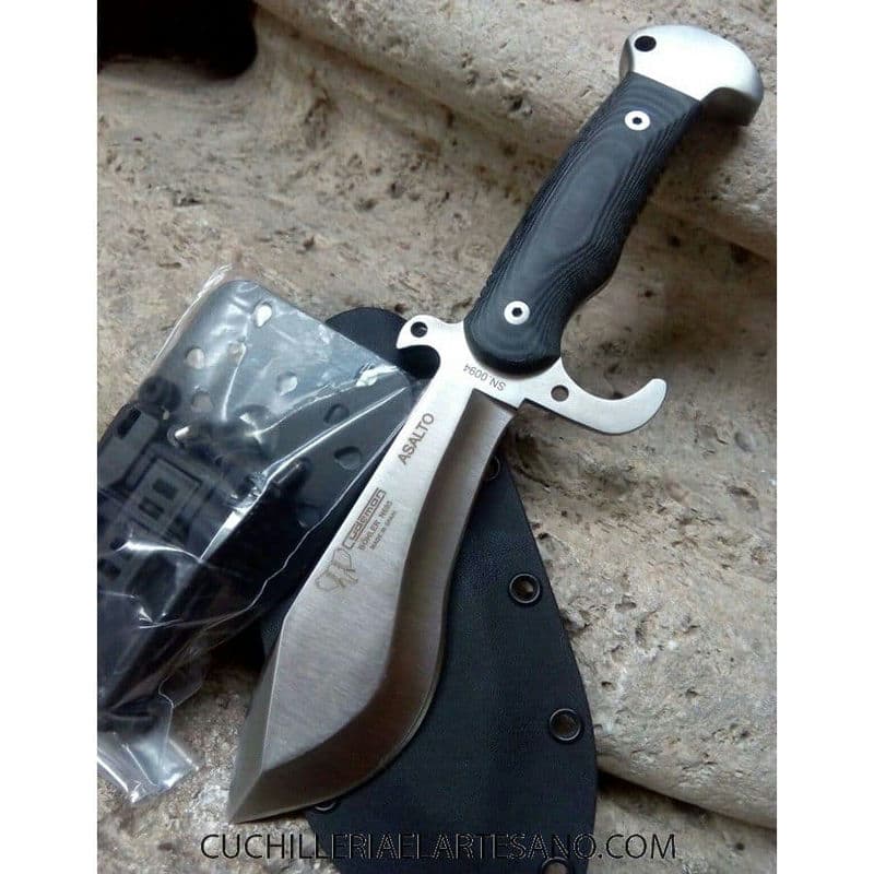 140-MK Cuchillo de monte o machete de asalto de Cudeman, hoja de acero Böhler N-695 con vaciado cóncavo, acabado de hoja satinado, punta de la hoja drop-point, dureza del acero 59/61 HRc, guarda y pomo de acero A-304 CNC, longitud de hoja 14,5 cm, longitud total 26,5 cm, grosor de hoja 5 mm, anclaje del mango con tornillo allen inox/casquillo interior roscado de latón, mango de madera mikarta negra, peso del cuchillo 380 gr, con agujero para cordón fiador, punta rompecristales y funda de kydex multiposicional.
