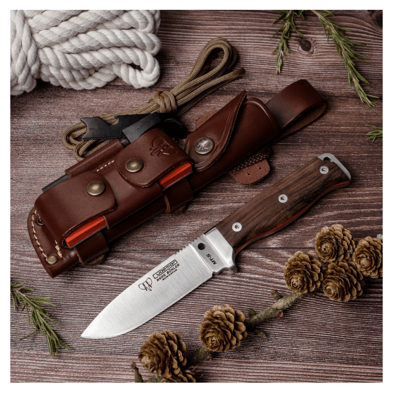 120-GC Cuchillo de caza de Cudeman modelo MT-5 con kit completo de supervivencia. Hoja de acero bÖhler n-695; dureza del acero: 59/61 hrc; longitud de hoja 11 cm; longitud de mango 11,5 cm; grosor de hoja 5,33 mm; virola de acero inoxidable a-304 pulida; mango de madera de nogal pulido con separador rojo; funda de cuero marrón (incluida); extra: agujero para cordón fiador; peso cuchillo: 240 gr. Incluye: Piedra de afilar - Espejo de señales - Reloj solar - Pedernal - Paracord marrón (2,80 m)