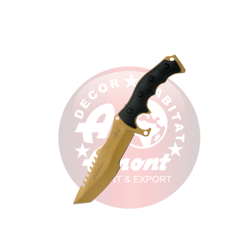 15622D Machete o cuchillo táctico modelo vencedor, hoja filo con sierra en la parte superior, hoja golden matt ti-coating inox, tamaño de hoja 15 cm y mango de 13,5 cm, el mango es de goma y golden matt ti-coating. Toda una pieza hasta atrás, enterizo, lleva un agujero en el mango para colgárselo y un pedernal.