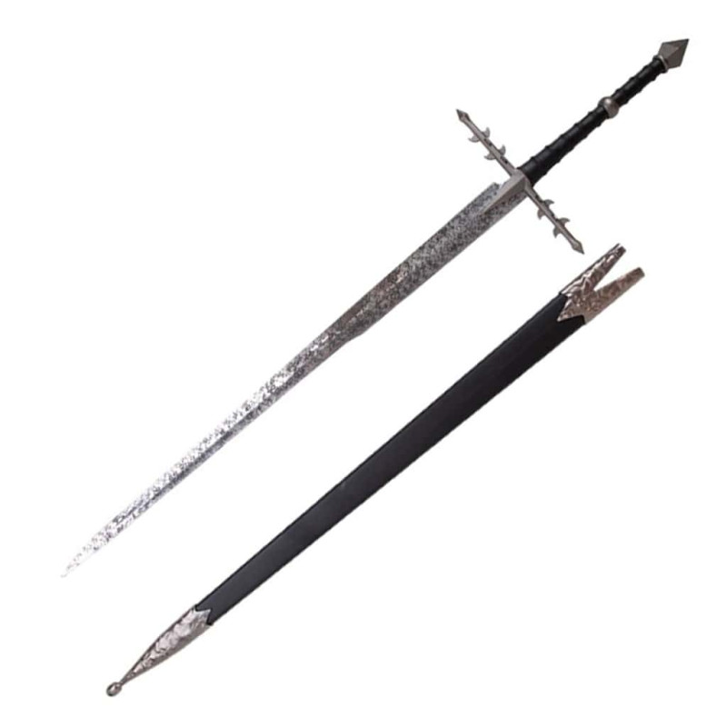 La empuñadura ha sido trabajada en aleación metálica de gran robustez, lo que le otorga firmeza y realismo al sostenerla. El mango delgado con acanaladuras no solo mejora la ergonomía, sino que también refuerza la estética oscura del conjunto. La guarda, alargada y terminada en puntas que recuerdan a garras afiladas o espinas, añade un carácter agresivo y amenazante al diseño. Por último, el pomo de forma piramidal aporta un toque elegante y simbólico, cerrando la empuñadura con un detalle distintivo que acentúa la personalidad de la espada.
