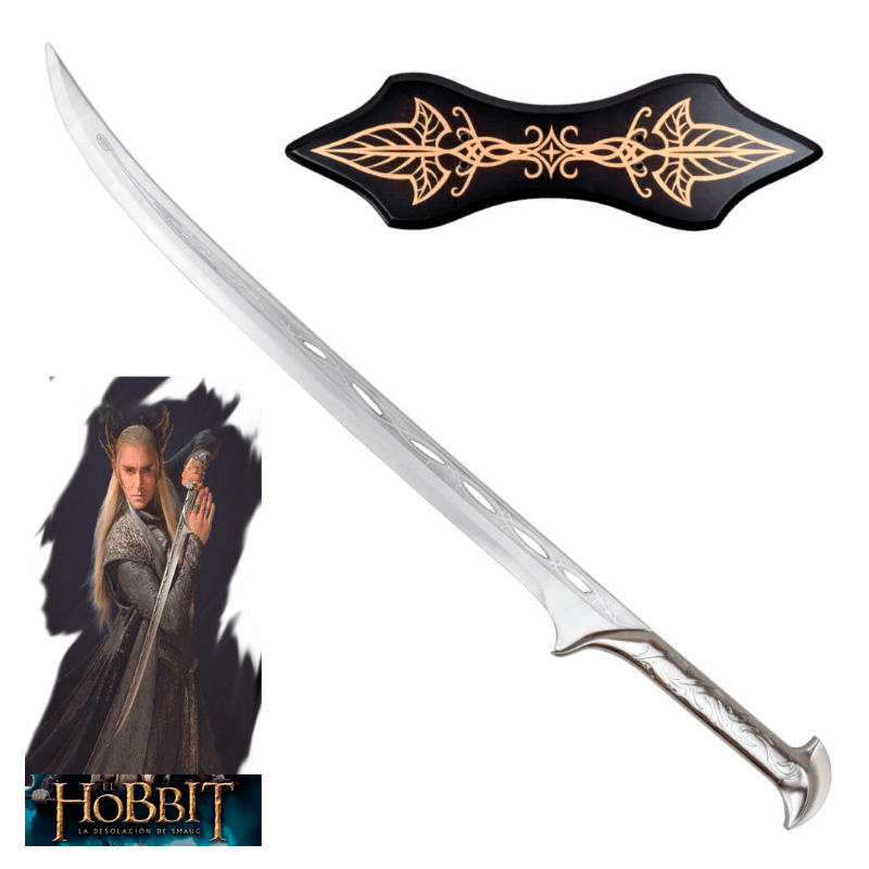 Espada réplica empuñada por el elfo Thranduil señor de los anillos ,acero inox, hoja calada, mango en acero con adornos, tamaño de hoja 69cm, tamaño total 96cm, grosor 4mm, peso 1,403gr, con expositor
