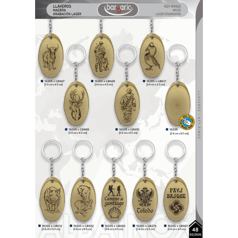 16305+GR661 Llavero madera ovalado con grabación a láser, modelo PAYS BASQUE, tamaño 3,6 x 6,5 cm.