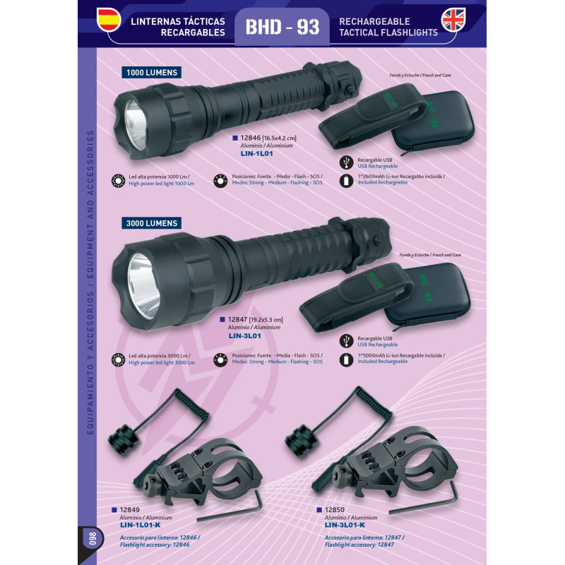 12846 Linterna led alta potencia 1000 lm, posición fuerte, media, flash, sos, recargable USB, con funda, tamaño 16.5x4.2 cm.