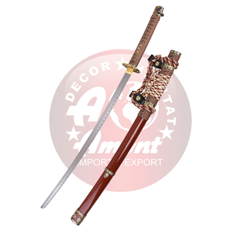 Tachi Decorativo S5113 de 102 cm hoja de acero acabado en satinado, con vaina de madera granate lacada y trenzado en marrón, blanco, amarillo y granate. Sin soporte. Ref. S5113