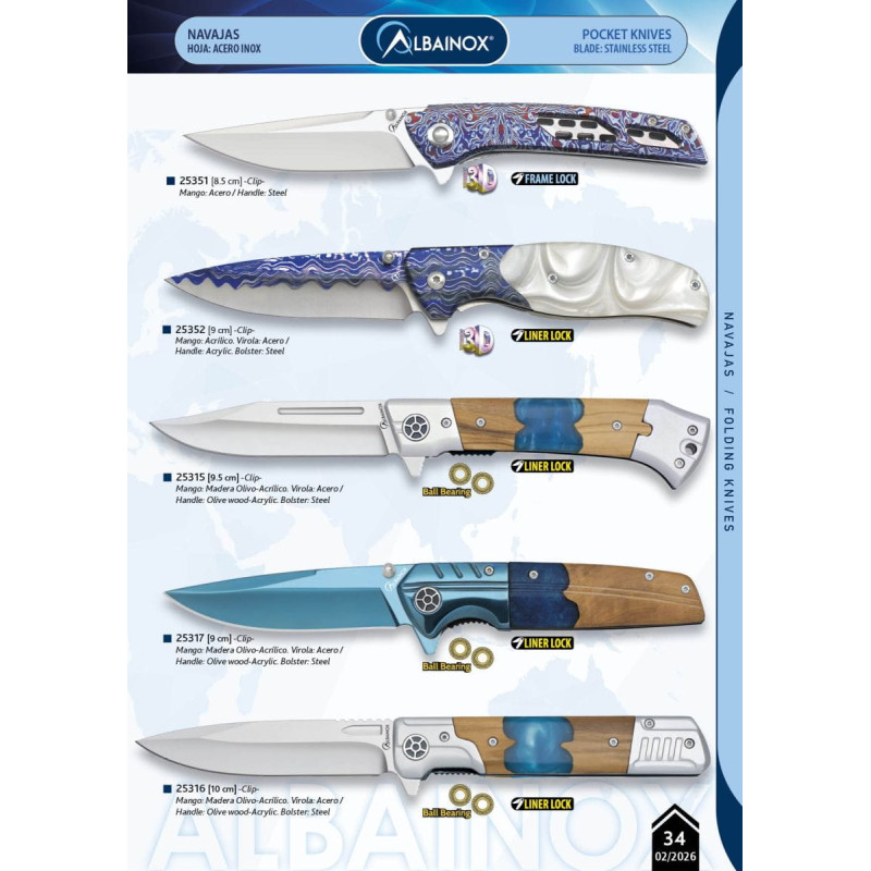 25316 Navaja acero 3cr13mov  ,sistema de rodamiento, virolas de acero en azul , mango en madera de olivo y acrílico , atornillada, sistema de cierre línea de bloqueo,  tamaño de hoja 10cm, con clip