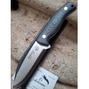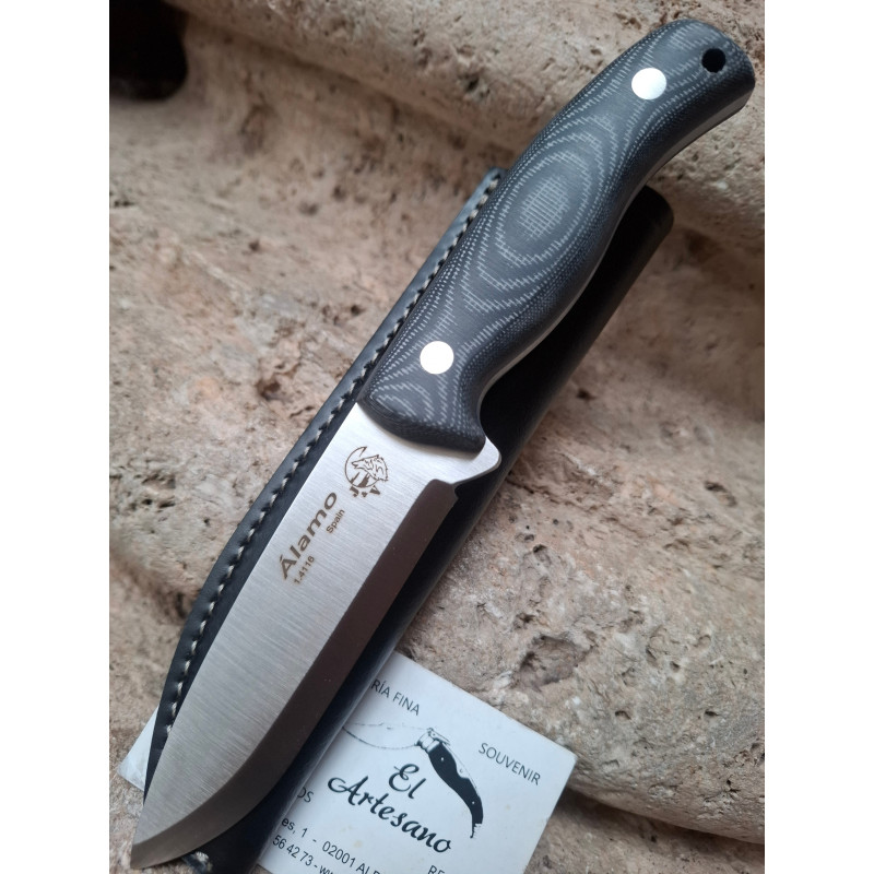 Cuchillo de monte o machete Álamo de J&V, hoja de acero inoxidable 1.4116, dureza 56-58hrc, mango de mikarta negra, remachado, todo una pieza enterizo, tamaño de hoja 11,4 cm, tamaño total 22,5 cm, ancho de pala máximo 3,2 cm, grosor de hoja 5 mm, con funda de cuero.