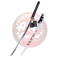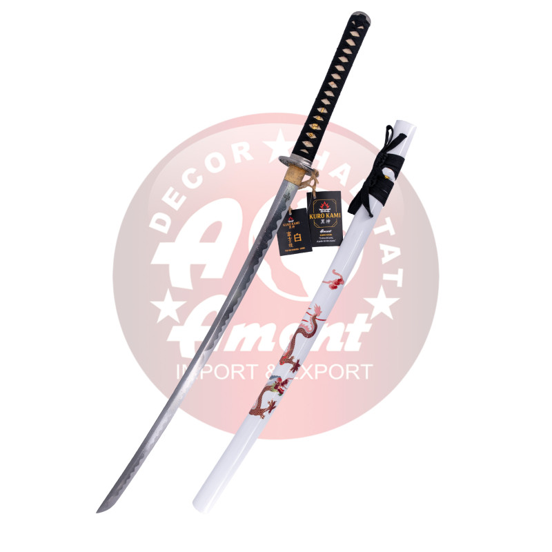 Katana de 105 cm de hoja realizada en acero de damasco de 800 capas certificado con hamon grabado haciendo el monte fuji en el centro de la hoja, vaina realizada en madera lacada en blanco con la tsuba y la otras partes metálicas hechas en acero inoxidable, mango con trenzado negro y piel de serpiente auténtica. Con soporte. Ref. S6073B