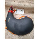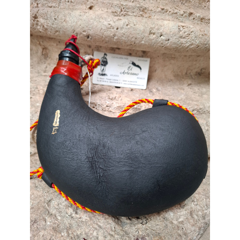 Bota de vino de pez, toda hecha a mano artesana, de 1 Litro curva negra, curtida en piel de cabra vegetalmente, interior de pez fabricada a base de resinas naturales pino y enebro, brocal elaborado en baquelita, con cordón para llevarla colgada, de primera calidad, capacidad de 1 Litro.