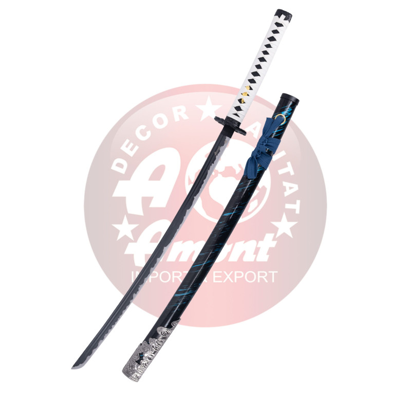 Katana S5123 de Ghost of Tushima réplica de 102,5 cm hoja de acero con abatanador acabado negro con dentado en satinado, mango con encordado blanco de polipiel blanca e imitación de piel de raya en negro, sin soporte. Ref. S5123