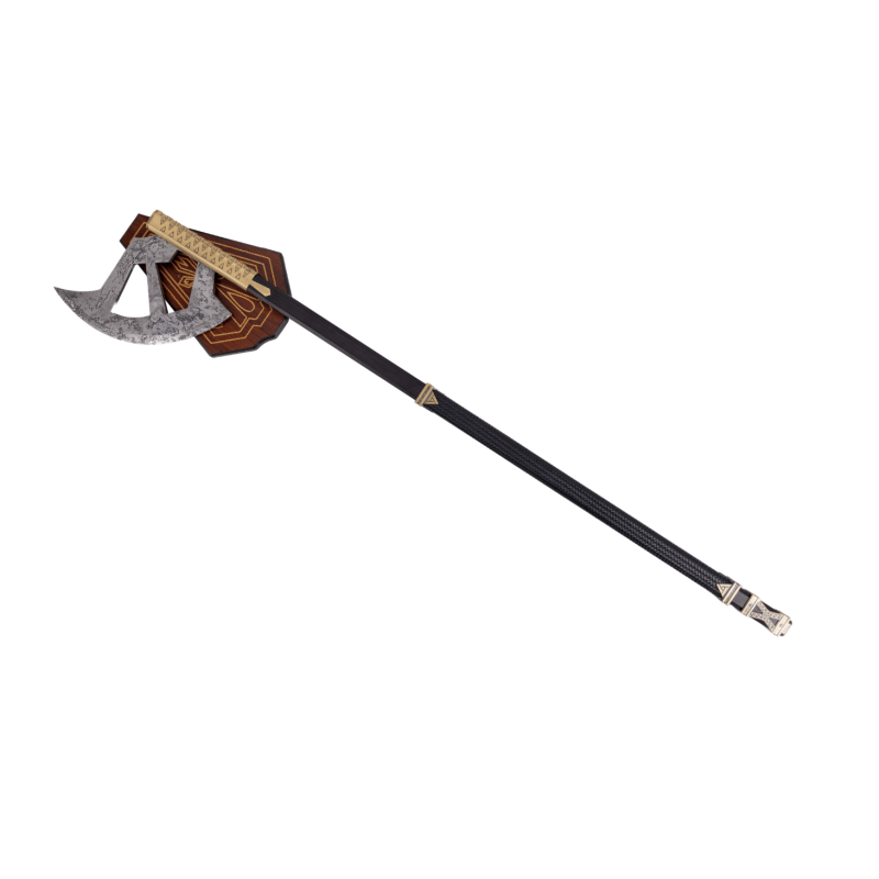 La Hacha de Gimli es una réplica pensada para exhibición o cosplay. Su hoja de acero con acabado efecto martillado aporta presencia y realismo, mientras que el mango de madera recubierto con polipiel trenzada negra y adornos metálicos ofrece un aspecto robusto y cuidada ergonomía. Se entrega con soporte para mostrarla en tu colección.