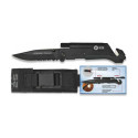 Navaja táctica K25, hoja de acero 7cr13mov con recubrimiento de titanio hoja filo y sierra, mango de aluminio negro, lleva una linterna en la parte superior y un pedernal, cutter para cortar cinturones y punta de tungsteno para romper cristales, sistema de bloqueo linerlock, tamaño de hoja de 9,5 cm y mango de 12,8 cm. Con funda de nylon y estuche de presentación.
