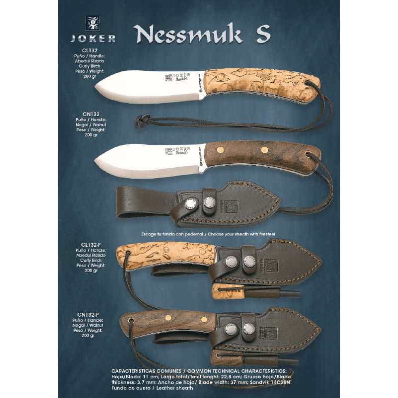 CL132P Cuchillo Nessmuk S de Joker, hoja de acero Sandvik 14C28N con vaciado scandi, denominación de origen AB, todo una pieza enterizo, remachado con remaches de latón, mango en madera de abedul con separadores negros, tamaño de hoja 11 cm, mango de 11,8 cm, grosor de hoja 3,7 mm, peso 200 gr con funda de piel de primera calidad, la funda permite tanto un porte vertical alto como bajo según se desee, con pedernal a juego con el mango del cuchillo.