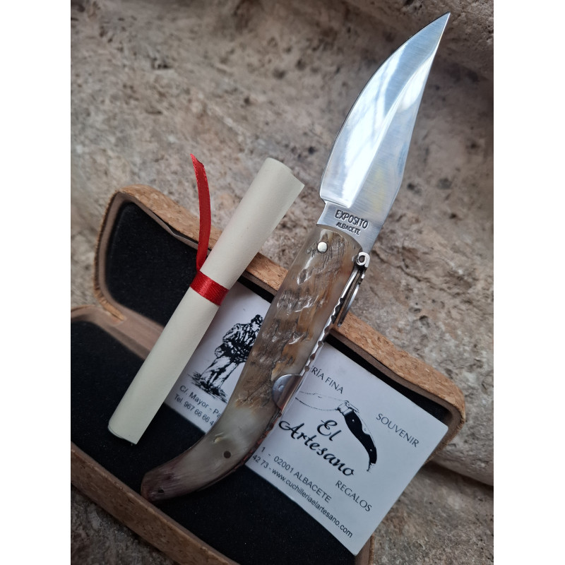 Novedad Navaja punta Expósito, con denominación de origen AB, todas las piezas son únicas, hecha a mano en artesania, hoja de acero mova acanalada, muelle trabajado, palanquilla rodeada, forros en acero, virolas en alpaca, cachas en asta de muflón, tamaño de hoja 9 cm, tamaño total 21 cm, con estuche y pergamino.