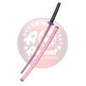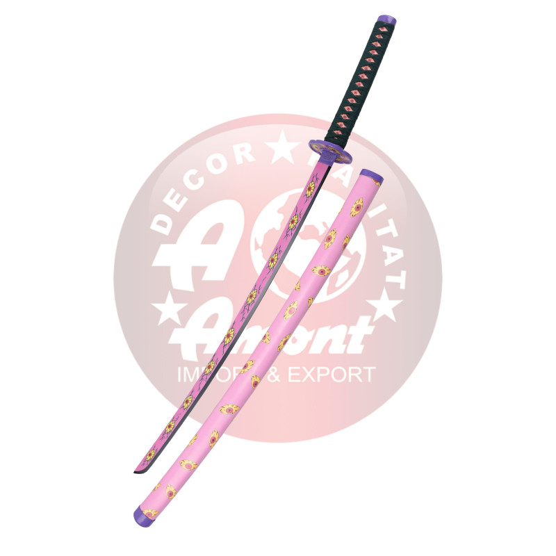 Katana S5121 de Demon Slayer Katana Kokushibou empuñada por Tsugikumi Michikatsu réplica de 103 cm hoja de acero decorada con rosa y ojos amarillos, mango con encordado lila, vaina rosa con ojos amarillos y detalles en lila. Ref. S5121