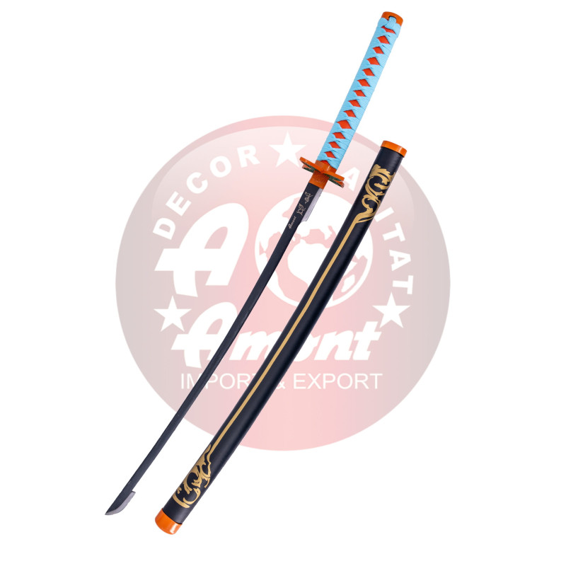 Katana S5124 de Demon Slayer empuñada por Kochou Shinobu réplica no oficial de 103 cm hoja de acero, mango con encordado de color azul cielo con piel de imitación de raya color naranja, vaina con grabados. Sin soporte Ref. S5124