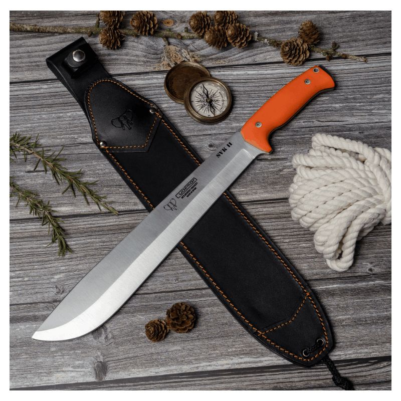 252-J Cuchillo de monte o machete cortacañas SVK II de Cudeman, hoja de acero molibdeno vanadio, mango de g10 naranja, atornillado, todo una pieza hasta atrás, enterizo, tamaño de hoja 31 cm, con funda de cuero.