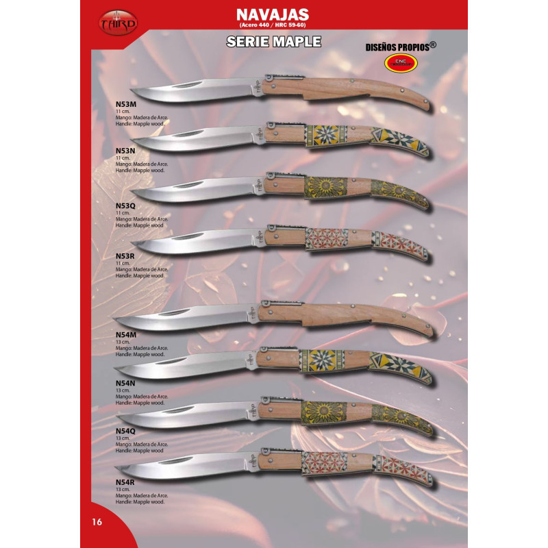 N54M Navaja de carraca de Third Serie Maple Wood N54M, realizadas con tecnología CNC, mango en madera Arce, hoja de acero 440 acabada en brillo espejo de 13 cm, con el muelle y la palanquilla decorada. Ref. N54M