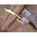 Navaja de carraca de Third Serie Mi Gitana Oro N49G, realizadas con tecnología CNC, mango con virolas de acero bañadas en Titanio dorado acabadas en brillo espejo e inserción de acrílico blanco, hoja de acero 440 bañada en Titanio dorado acabada en brillo espejo de 11 cm, con el muelle y la palanquilla decorada también bañados en Titanio dorado. Ref. N49G