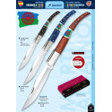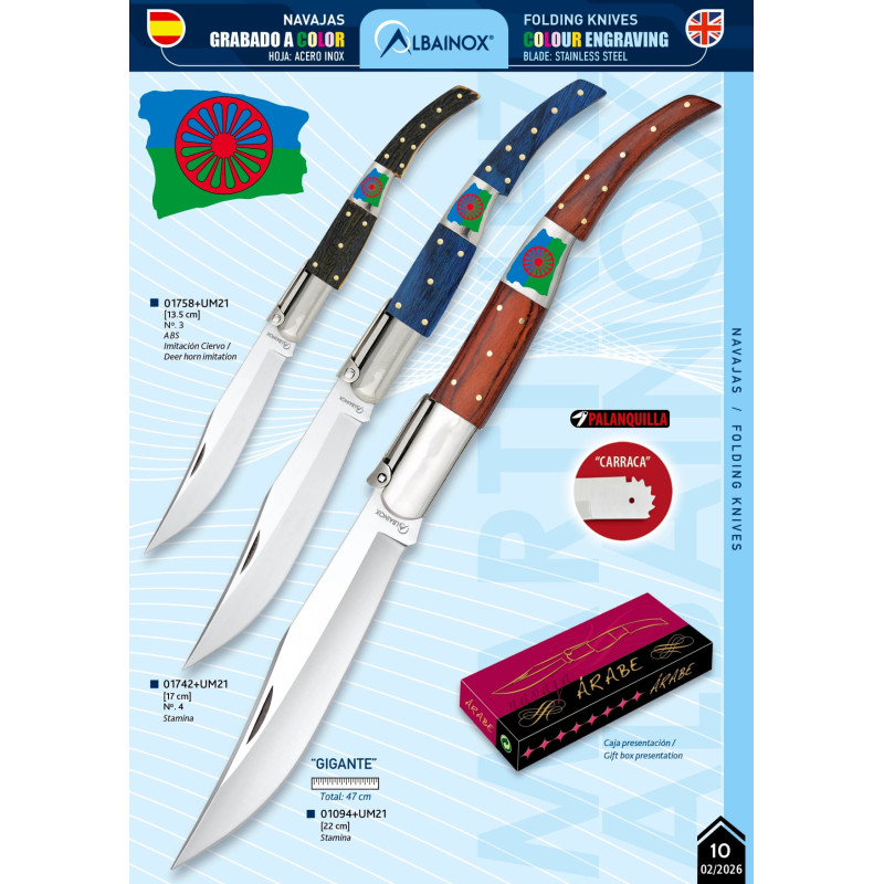 01742+UM21 Navaja árabe con carraca grabada a láser con la bandera gitana, hoja de acero inox, mango de stamina azul, tamaño de hoja 17 cm.