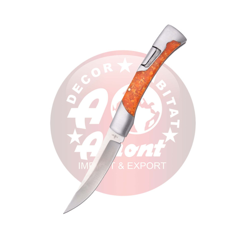 Navaja Third N198T, mango con virolas de acero pulido e inserción de acrílico fluorescente naranja con el muelle decorado, hoja de acero 440 de 9,3 cm con acabado satinado. Con bloqueo trasero, con clip. Con caja de presentación. Ref. N198T
