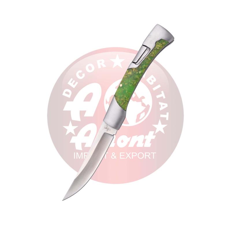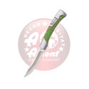 Navaja Third N198V, mango con virolas de acero pulido e inserción de acrílico fluorescente verde con el muelle decorado, hoja de acero 440 de 9,3 cm con acabado satinado. Con bloqueo trasero, con clip. Con caja de presentación. Ref. N198V