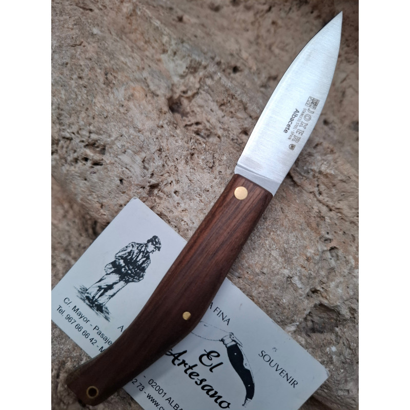 NN144 Navaja Campera de joker, hoja de acero Mova, forros de acero, remachada con remaches de latón, mango de madera de nogal, sistema de cierre de pistón, tamaño de hoja 7,8 cm, peso 60 gramos.