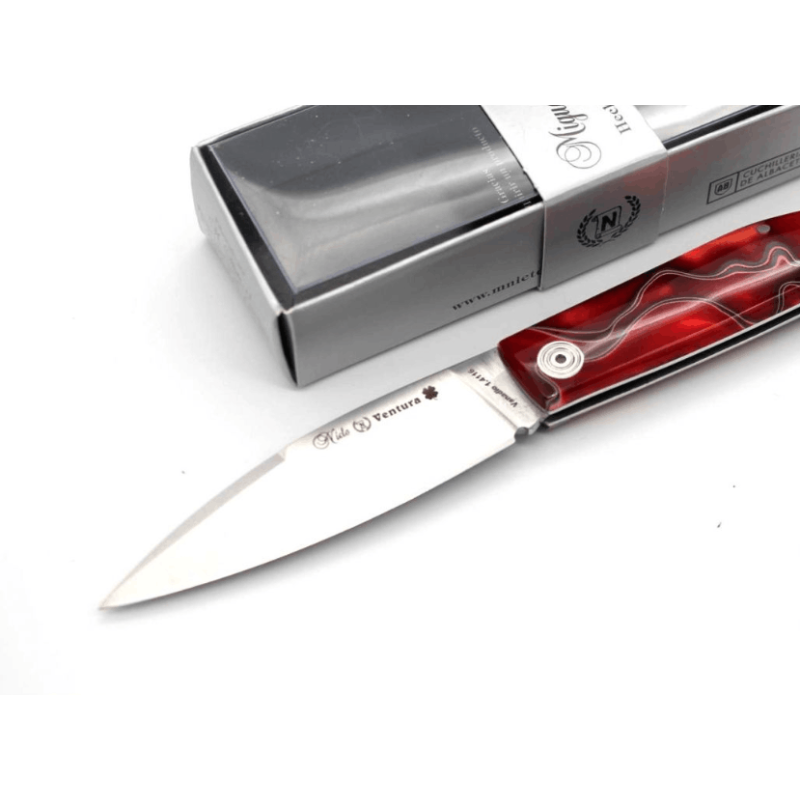 Navaja de Miguel Nieto modelo Ventura, hoja de acero vanadio 1.4116 con contrafilo, mango de metacrilato rojo, remachado con remaches de acero, forros de acero, sistema de cierre de pistón, tamaño de hoja de 8 cm, mango de 10 cm.