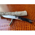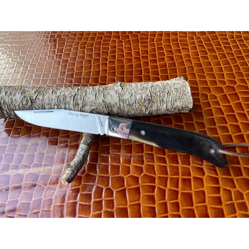 Exclusiva navaja Nieto Buckler, hoja de acero Böhler N-690 cobalto con uñero, mango de carnero pulido con virola de acero , sujeción con tornillos Allen, muelle en acero y forros pulidos, sistema de cierre de pistón forzado a 2 tiempos, tamaño de hoja 9 cm, tamaño de mango 10,5 cm., funda de la foto no incluida