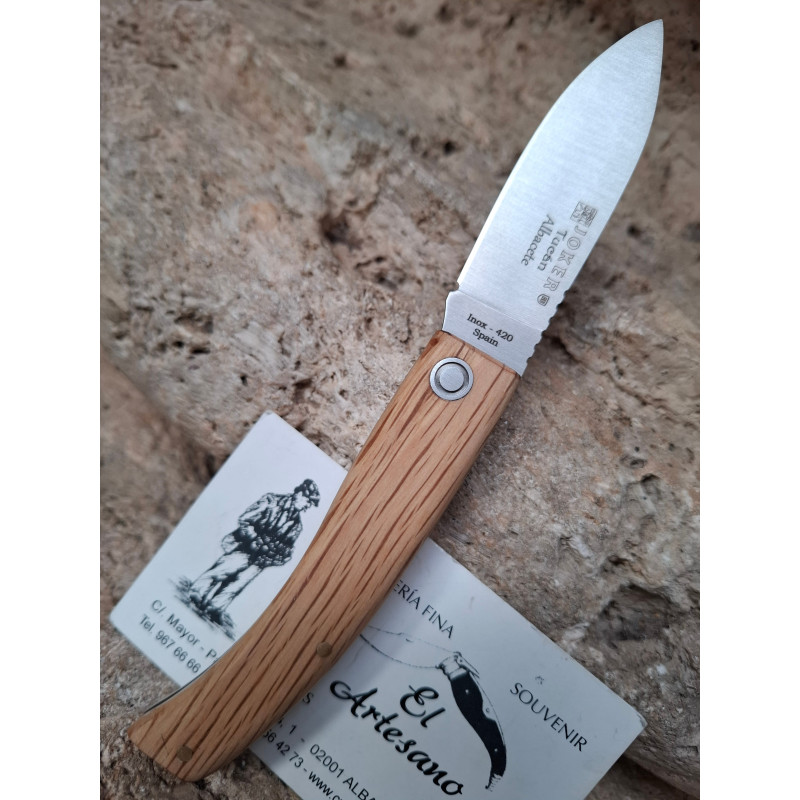 Navaja de caza de Joker línea Tucán, con denominación de origen ab, hoja de acero molibdeno vanadio , mango de madera de encina,muelle adornado, sistema de cierre de pistón, tamaño de hoja de 7,5 cm.